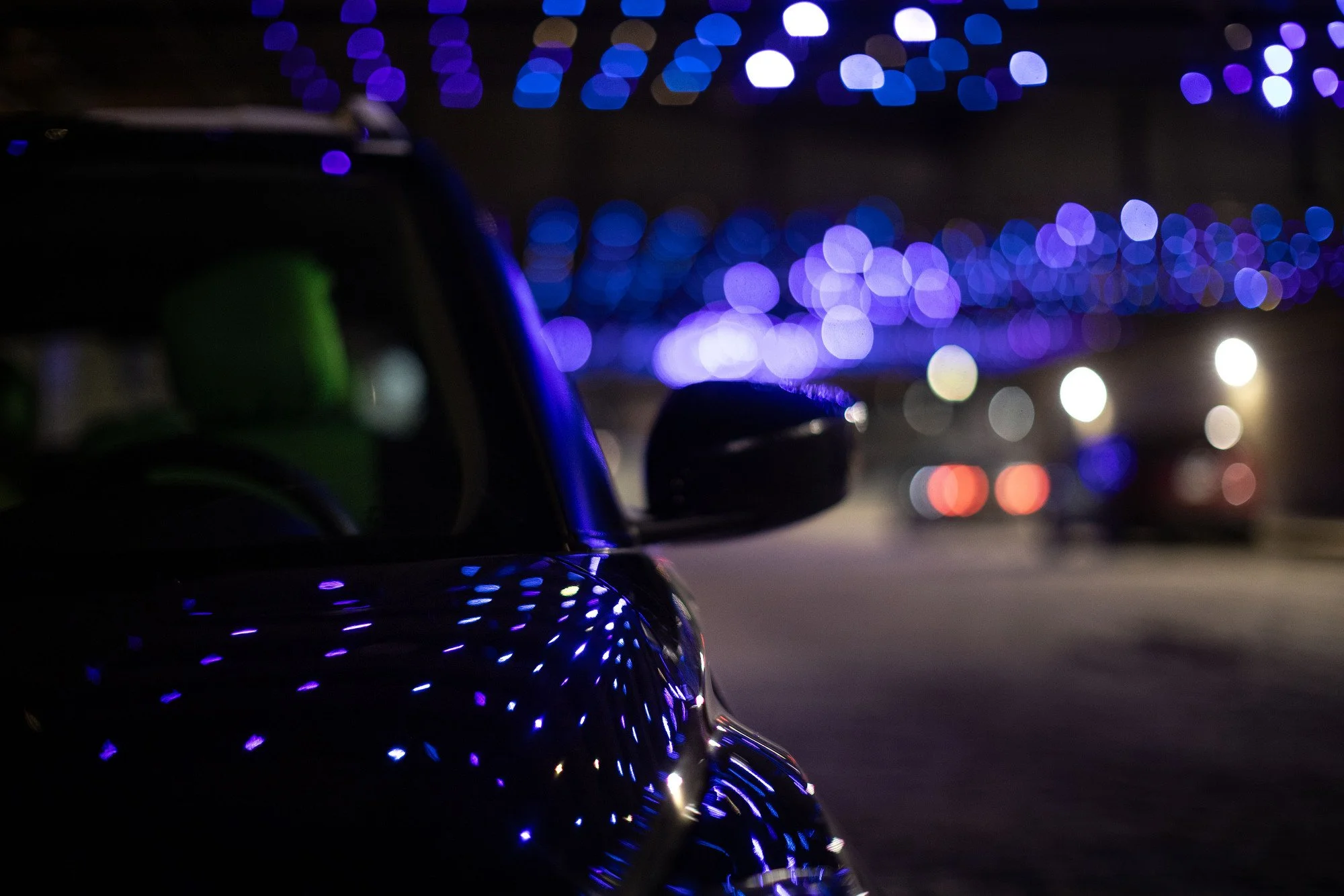 Blue lights in an underpass linking Main Street and The Forks dot a car parked alongside.