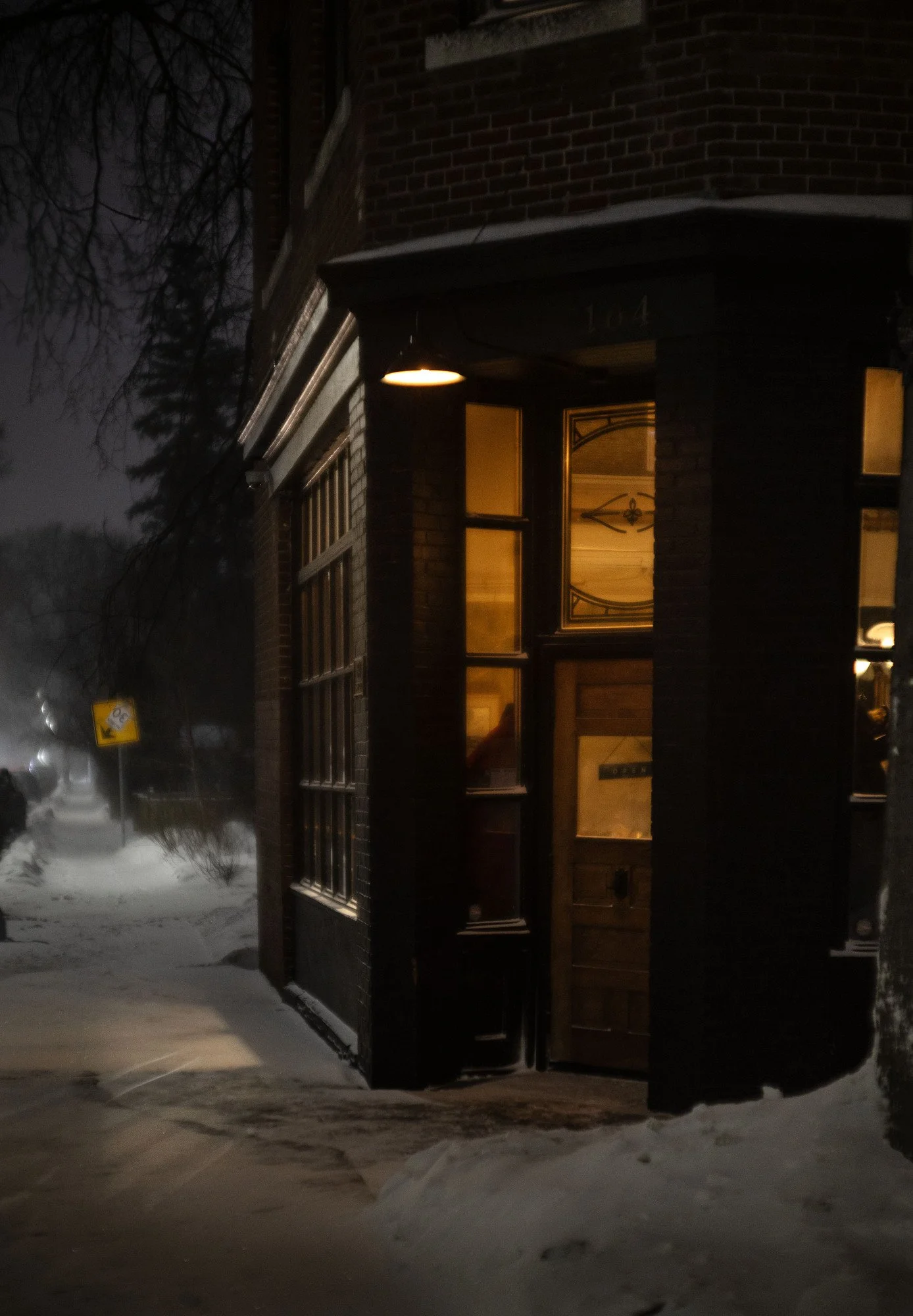 Warm light emanates from the Langside Grocery cafe in West Broadway.
