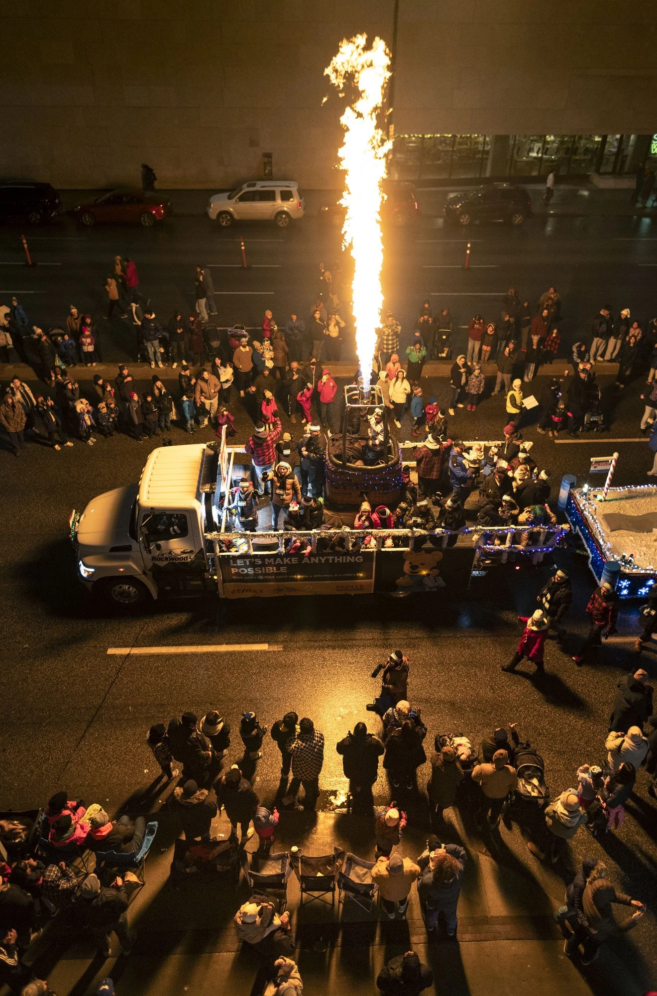 Fire lights the night during the 2023 Santa Claus Parade, on Colony Street in Winnipeg.