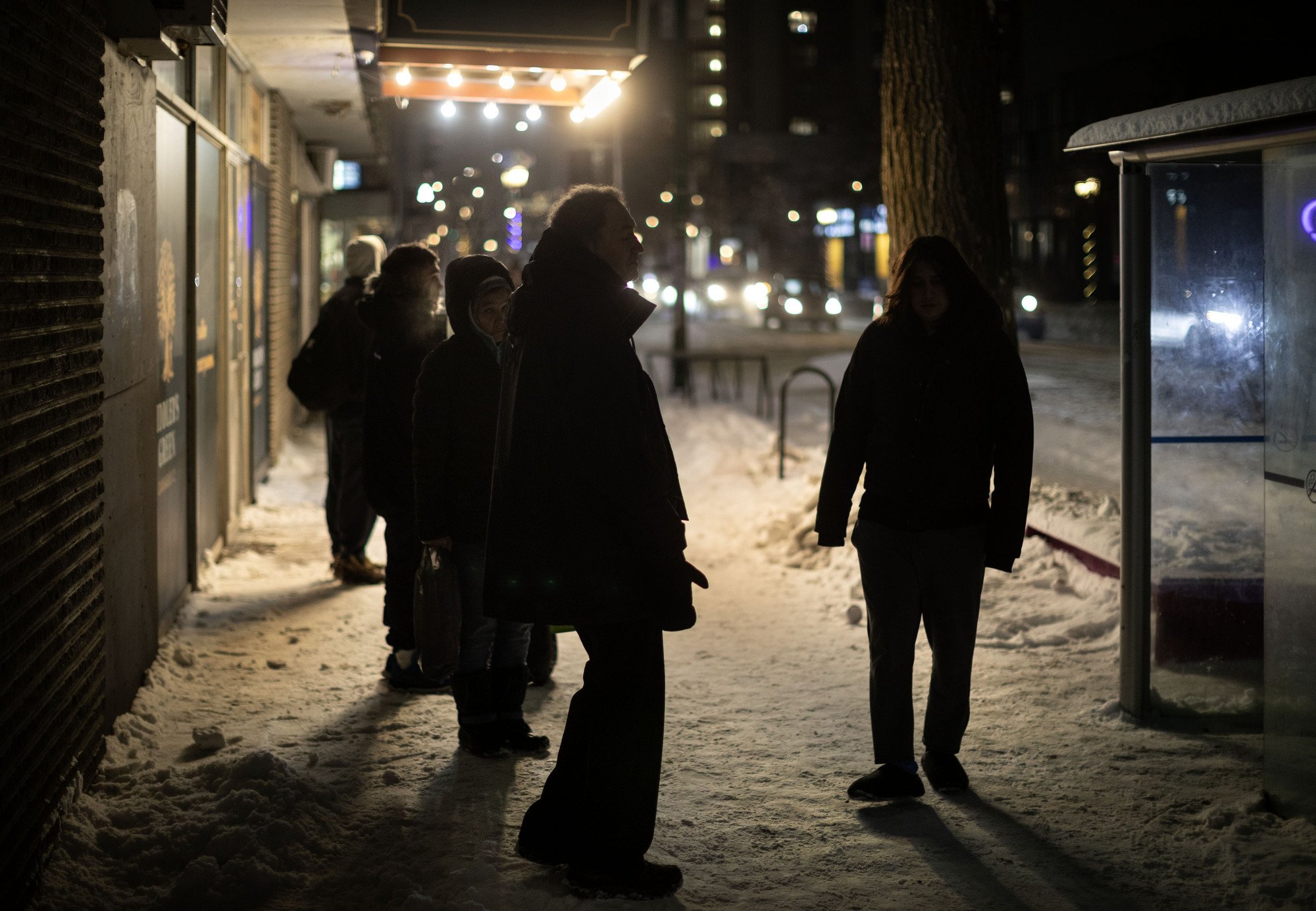 People queue for a bus at a stop on Sherbrook Street near Westminster Avenue in Winnipeg.