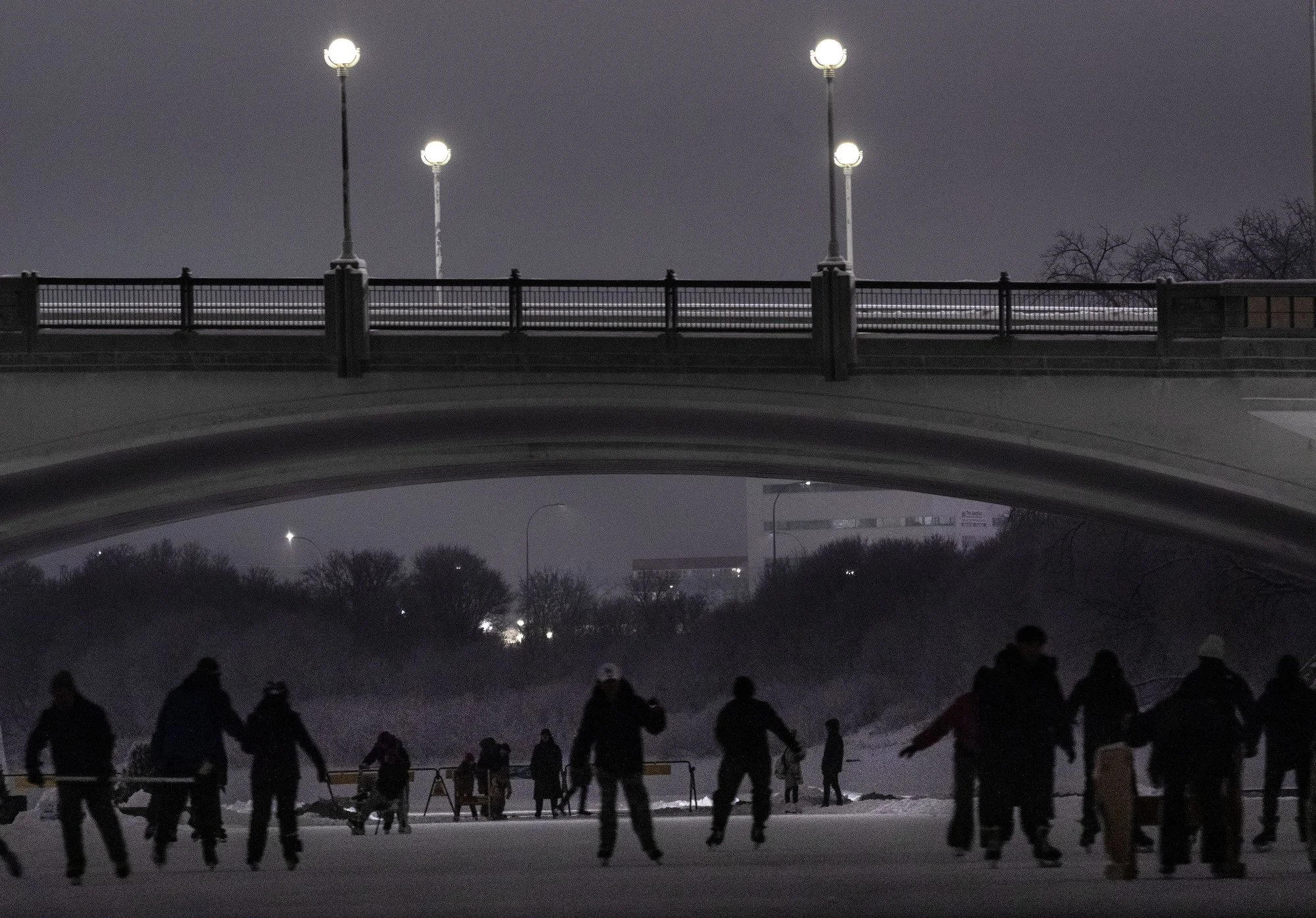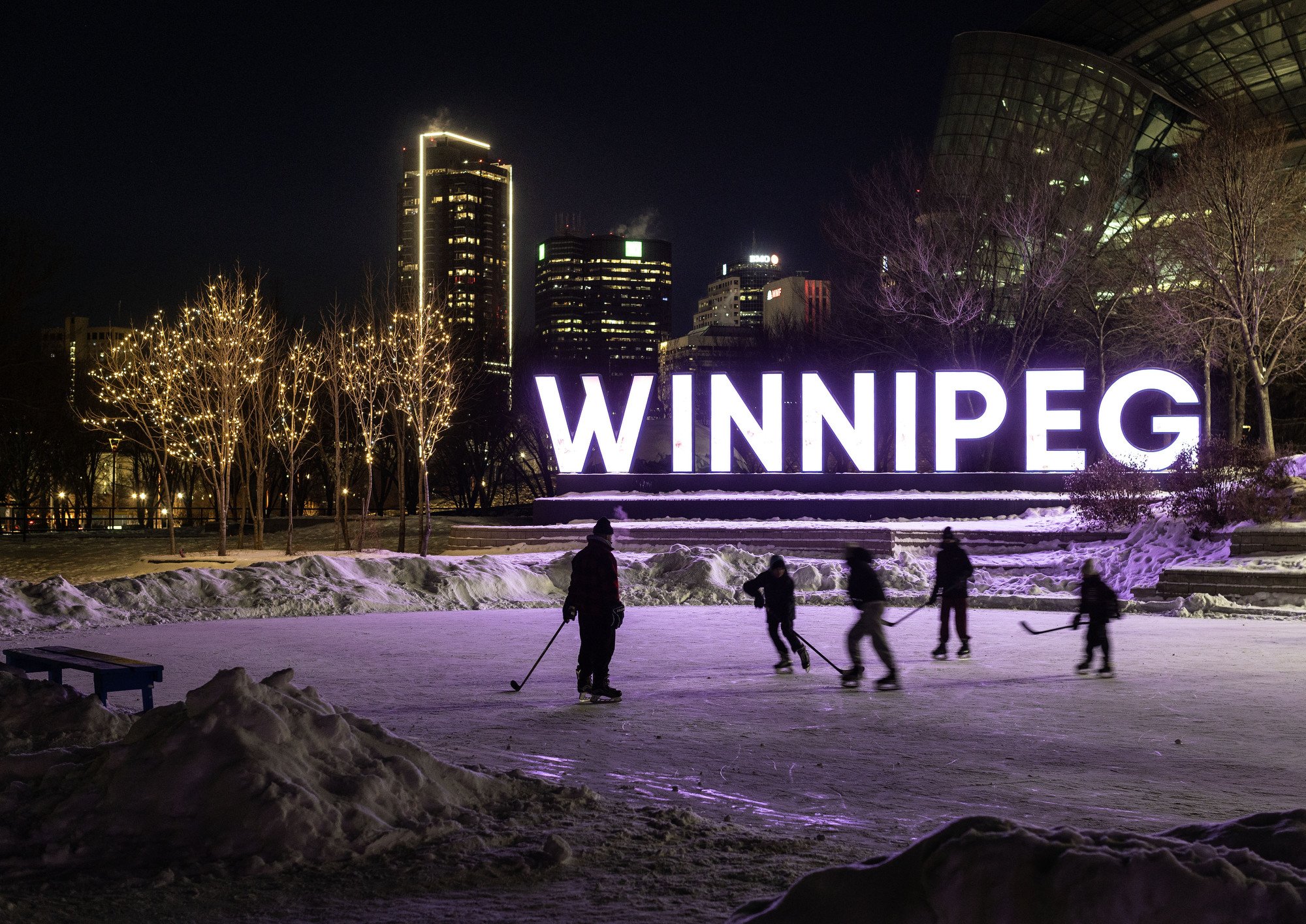 Skaters wheel around in a pool of coloured light at the Forks with the Winnipeg skyline as a backdrop