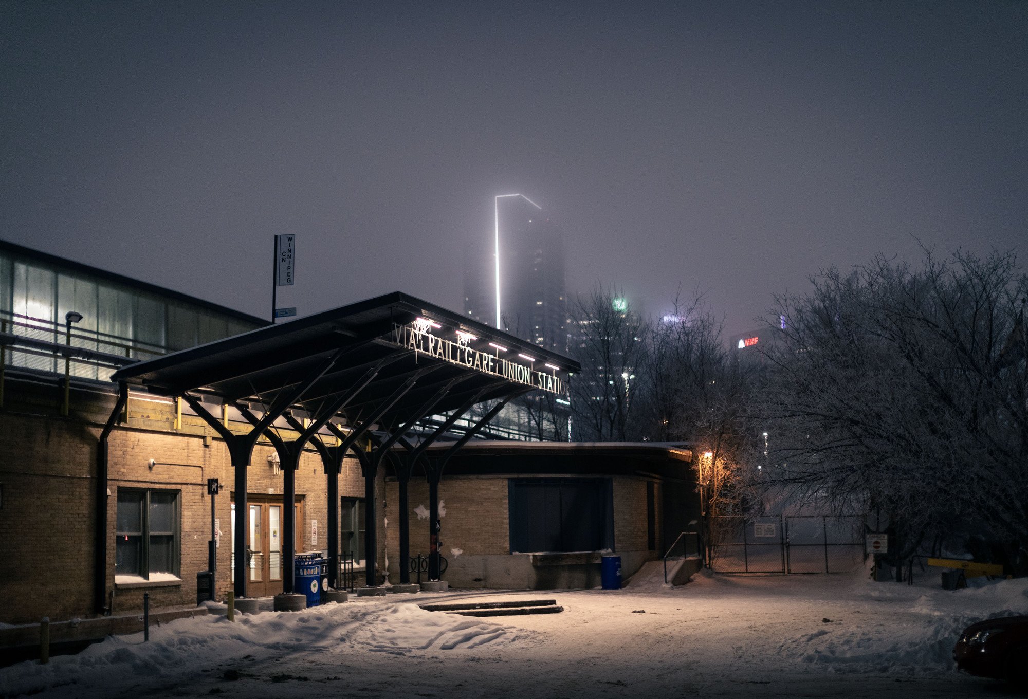 An entrance to Union Station glows softly in a foggy winter night, with the 300 Main building behind it.