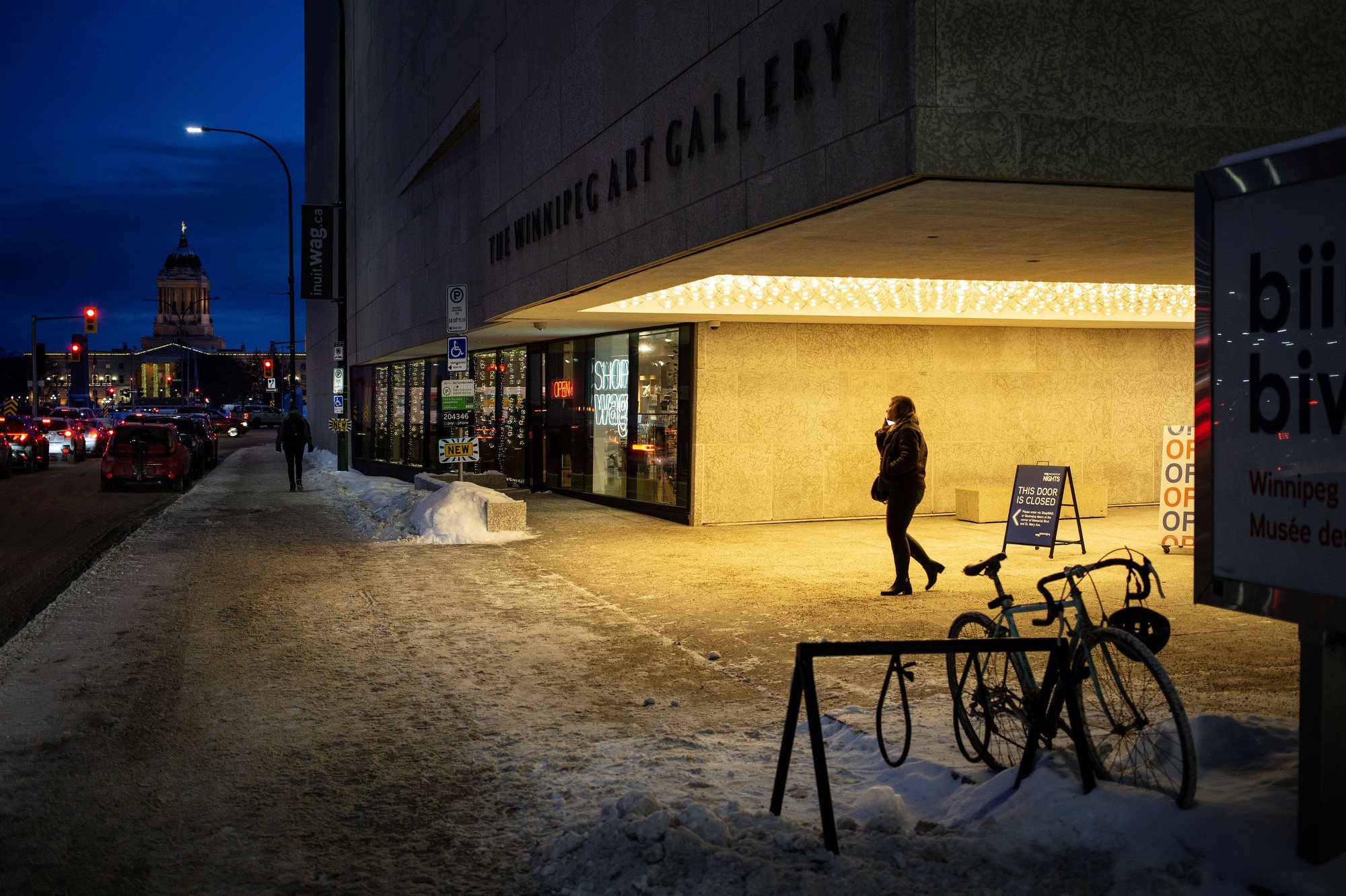 A pool of warm light at the Winnipeg Art Gallery offers an oasis from the cold blue light of the downtown, including the Manitoba Legislature in the background.