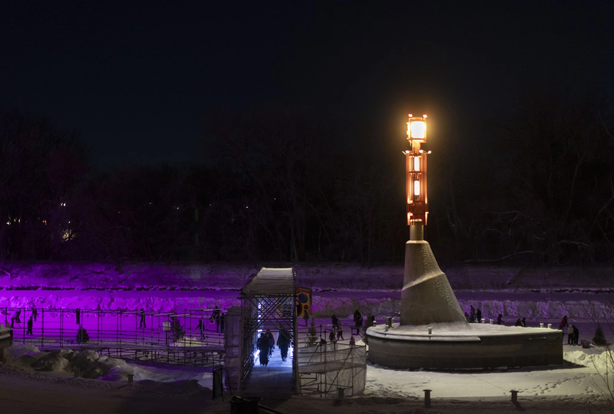 The pier at The Forks lights the night above the Nestaweya River Trail seen bathed in purple light along the Assiniboine River.