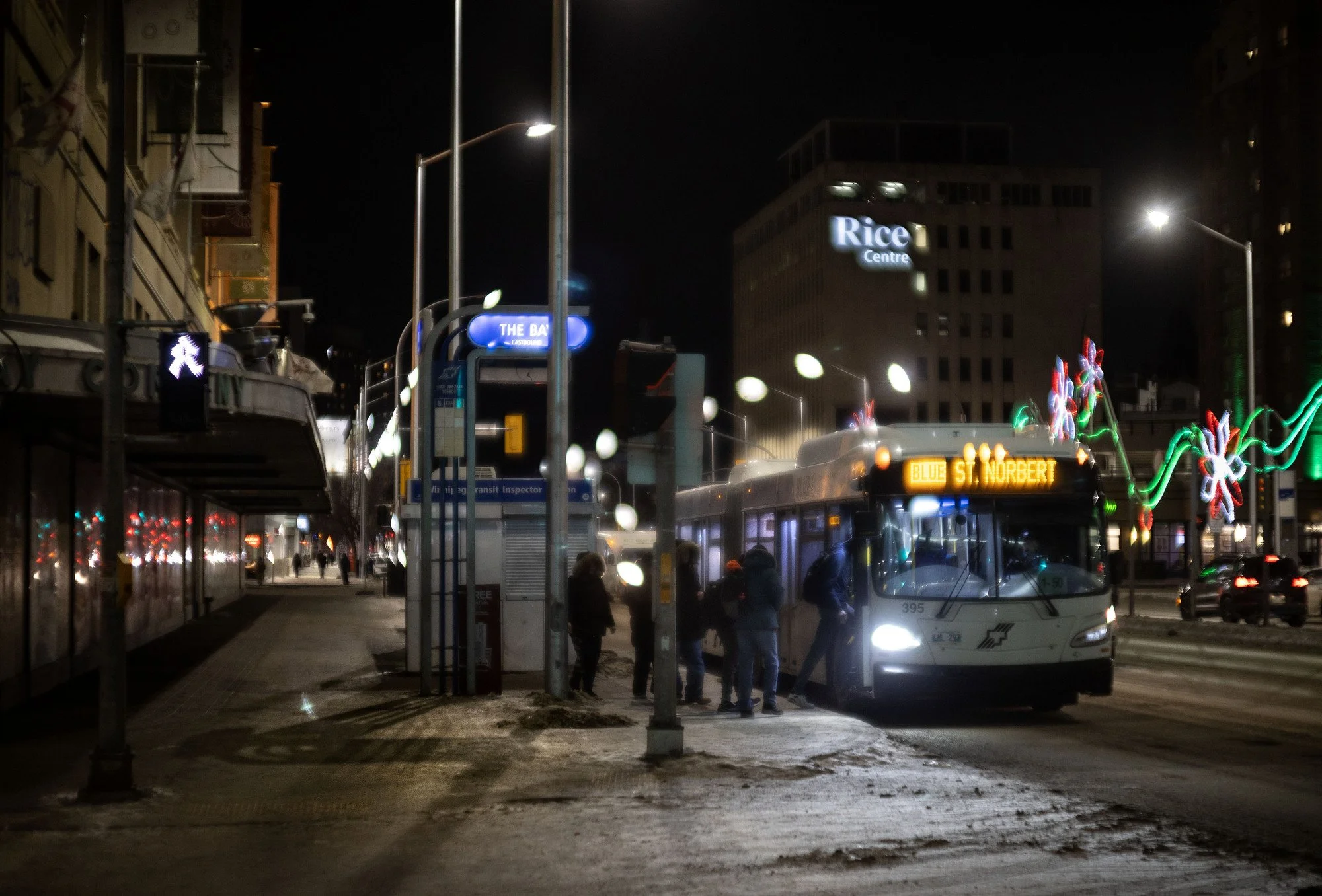 Riders board a bus pulling up to a stop on Portage Avenue near the historic Bay building in Winnipeg.